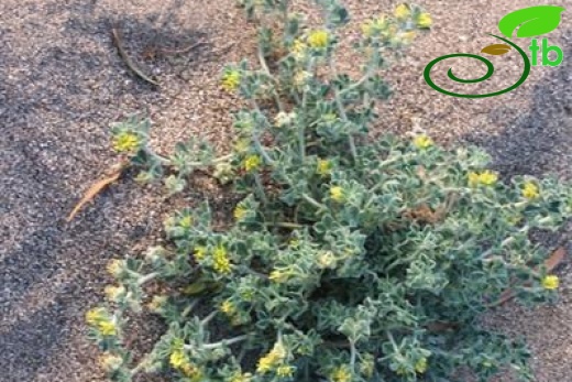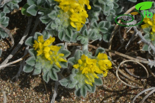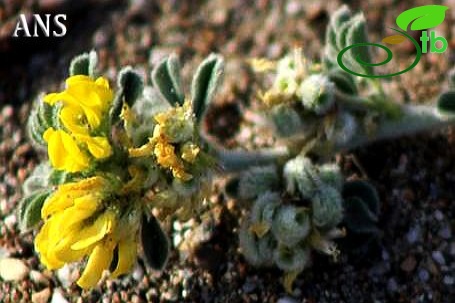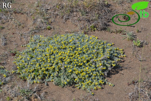 Prostrate perennial, 10-20 cm, woolly-canescent. Stipules nearly entire. Leaflets 8-15 x 5-8 mm, obovate-cuneate, obtuse, apiculate, dentate in the upper part. Peduncle 5-12-flowered, about equal to petiole. Flowers 7-10mm. Calyx teeth longer than tube. Corolla at least 2 x calyx. Young fruit protruding sideways from calyx. Fruit discoid or cylindrical, truncate at both ends, to 4 mm high, usually with short and thin spines, sometimes nearly spineless, villosulous; coils 2½-3, 5-7 mm diam., loose; surface of coils with a small number of radial veins branching near lateral vein. Fl. 2-6. Coastal sands, rarely on shingle or sea cliffs, nr. s.l.